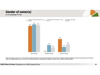 Men dominated both LGBTQ ownership groups, accounting for 66% of majority owners and 70% of those with minority stakes. Women accounted for 33% of the LGBTQ majority-owned firms and 13% of LGBTQ partially owned firms.